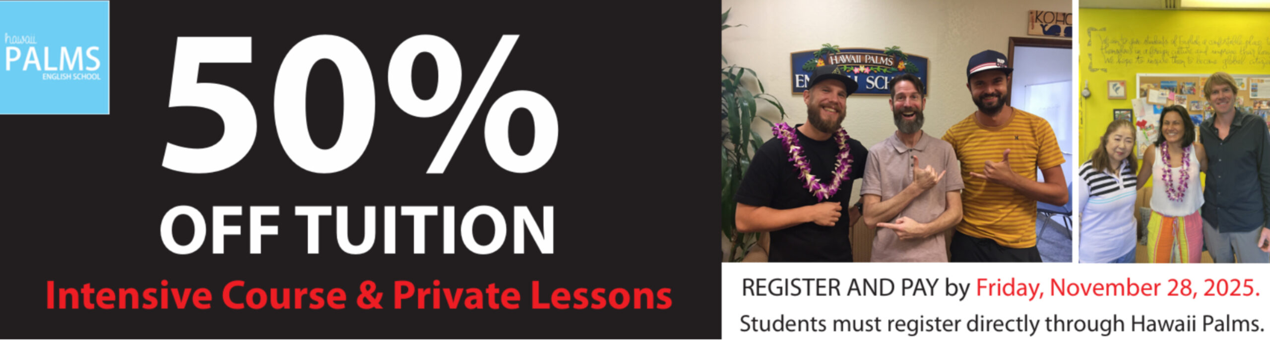 Founded in 2007, Hawaii Palms English School has been the gathering place for students of all ages, English levels, and nationalities to experience an English-speaking environment with the true taste of Aloha. With no more than 9 students per class, you can receive the personal attention needed from our dedicated teachers to LEVEL UP.