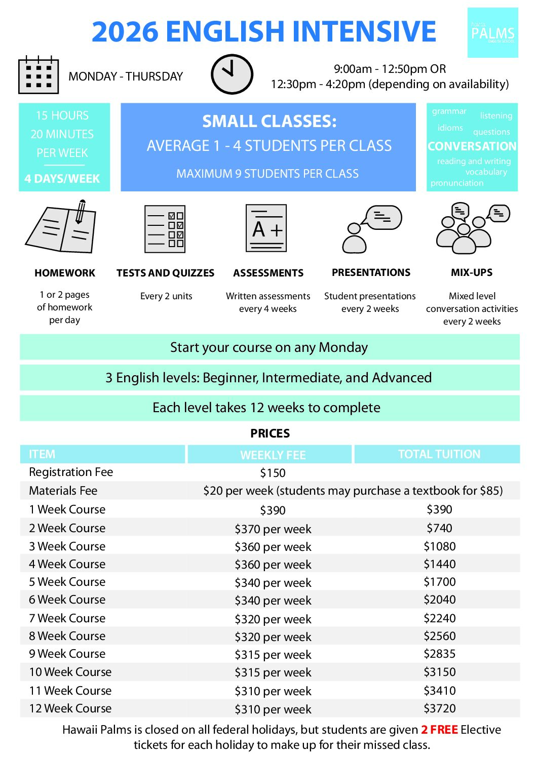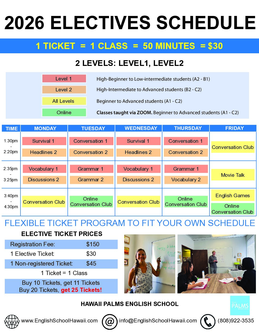 CONTENT: Individual modules that focus on 1 language skill per class: Conversation, Grammar, Survival English, Vocabulary, and Idioms/Slang