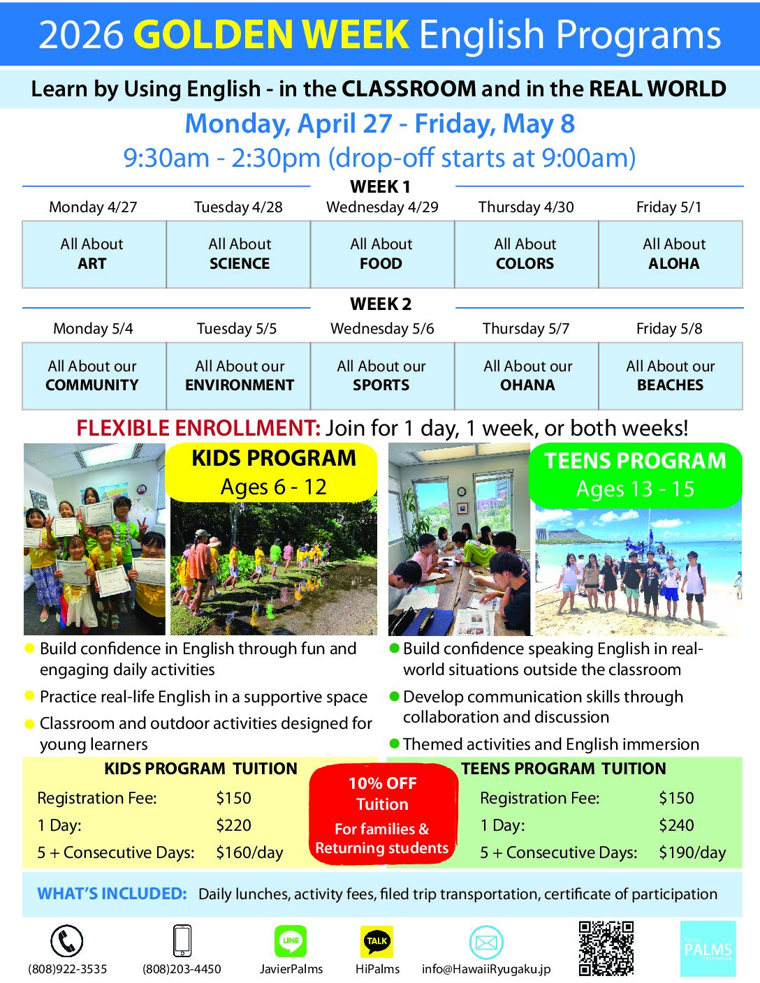 Student ages 6 to 15 – Practice English and Enjoy Activities All Over Honolulu!