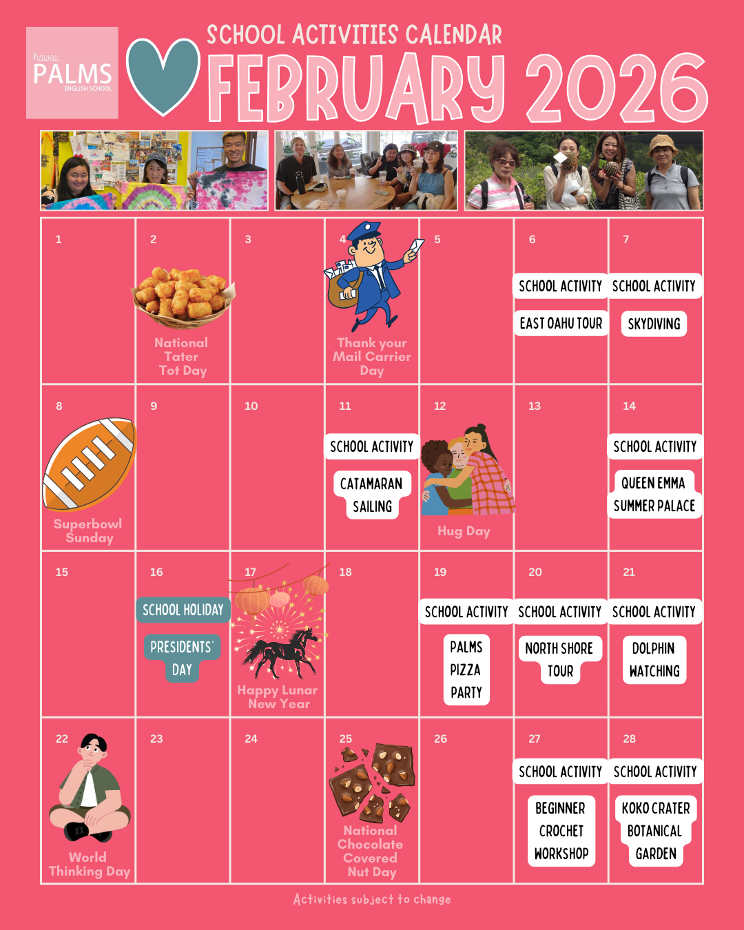 We plan activities every week so students can practice their English outside of the classroom.