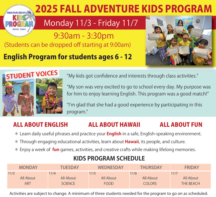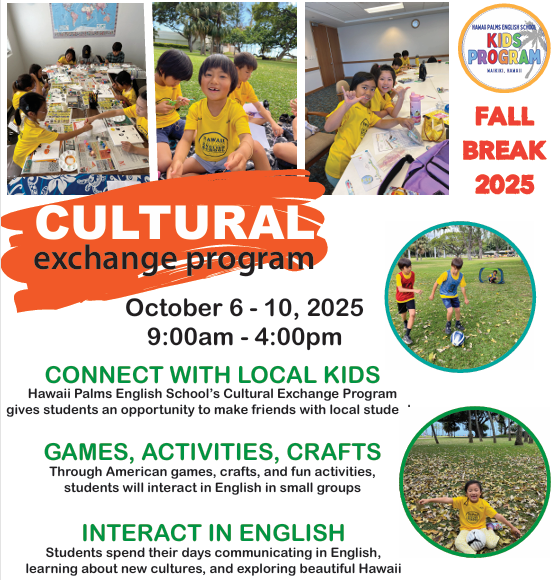 OCTOBER: With schools on Fall Break in Hawaii, it’s a great opportunity for international students to learn, play, and communicate with local elementary school kids. It’s a rare (mini) study-abroad opportunity.